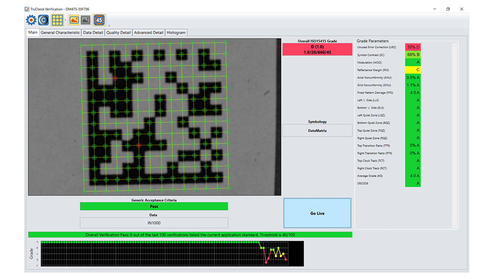 Die DataMan 475V Barcode-Prüfsoftware liefert intuitive optische Diagnoseinformationen zur Erkennung von einmaligen oder laufenden Problemen mit der Codequalität. Sie legt eine auf Messungen ISO-definierter Qualitätsparameter basierende Gesamtklasse für einen Code fest. Diese Parameter messen mehrere Faktoren, die sich auf die Fähigkeit eines Barcode-Lesegeräts zur Erkennung und Dekodierung eines Codes auswirken, indem sie die Leseraten im Down-Prozess maximieren.