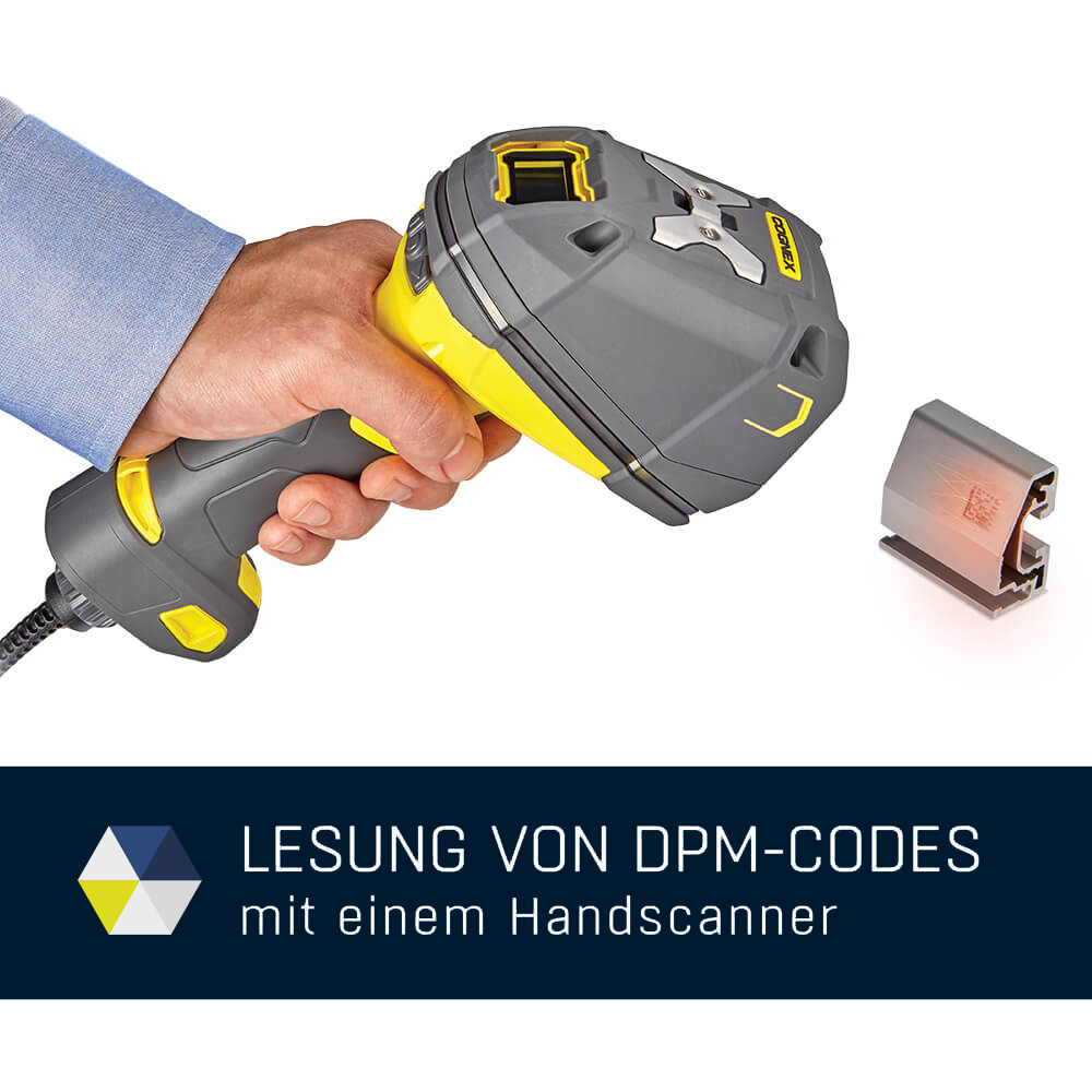 Die Kennzeichnung mit direktmarkierten Codes (DPM) ermöglicht eine sichere Identifikation von Bauteilen im Produktionsprozess. Im Gegensatz zu gedruckten Codes stellen DPM Codes, die mittels eines Nadelprägers oder Lasers direkt auf die Produktoberfläche aufgebracht werden, hohe Anforderungen an die Lesetechnik. Insbesondere in manuellen Arbeitsprozessen werden hier an Handlesesysteme hohe Anforderungen an den Decodieralgorithmus, die Beleuchtung und die Auflösung gestellt.